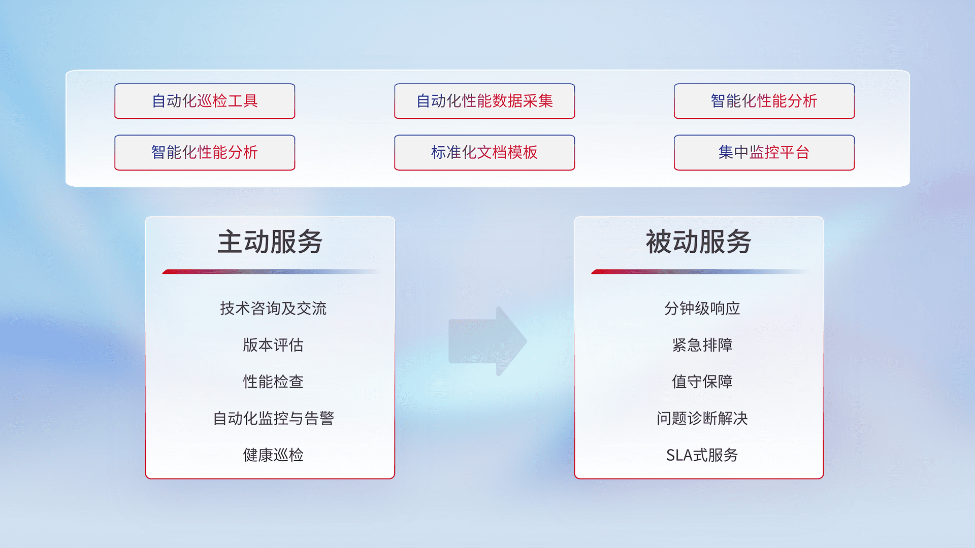 智能化工具和标准化文档,,,,保障服务质量,,提供主动服务(包含技术咨询、、版本评估、、性能检查、、、自动化监控与告警、、、健康巡检)和被动服务包含(分钟级响应、、、紧急排障、、、、值守保障、、、问题诊断解决、、、SLA服务)。。